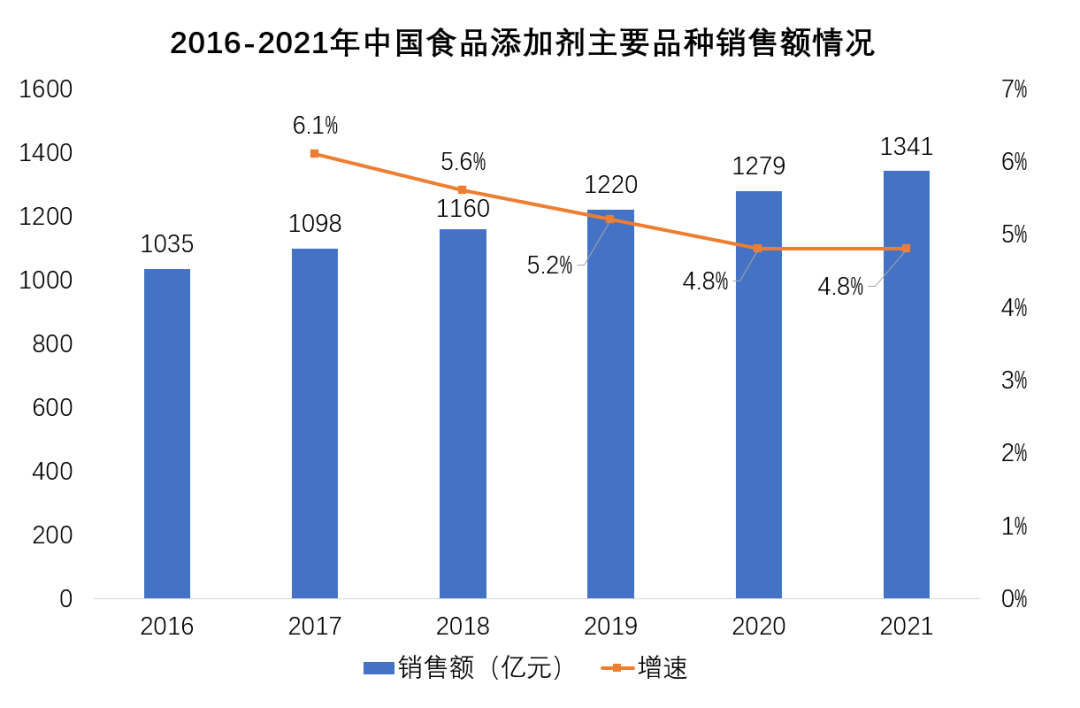 隨著經濟發展水平的不斷提高,消費理念的不斷升級,消費者對食品的可口性和安全性的關注度不斷提升,同時,在我國經濟持續增長、內部需求不斷擴大的環境下,食品添加劑行業迅速發展,銷售額也隨之不斷增長。2021年我國食品添加劑主要品種銷售額達1341億元,同比增長4.8%。