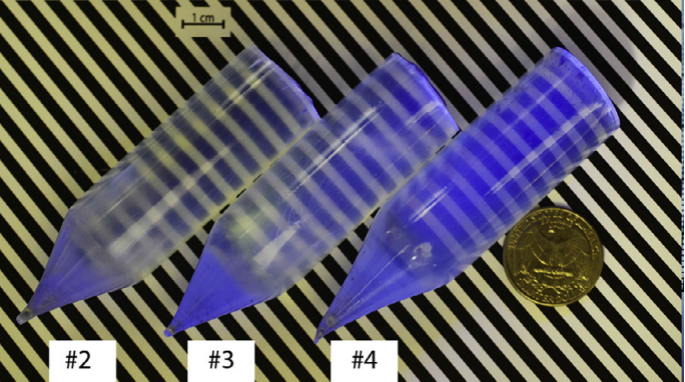 圖1 美國(guó)田納西大學(xué)閃爍材料研究中心在多坩堝晶體爐內(nèi)同時(shí)生長(zhǎng)出來(lái)的3塊Φ1"的KCaI3:Eu晶體毛坯