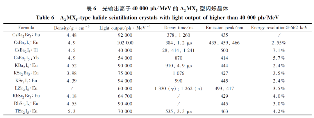 文中的大量表格是作者幾十年來(lái)對(duì)非氟鹵化物閃爍晶體研究狀況總結(jié)的高度濃縮,對(duì)閃爍晶體研究和從業(yè)人員具有重要的指導(dǎo)意義。(限于篇幅,這里僅示出幾個(gè)有代表性的表格)